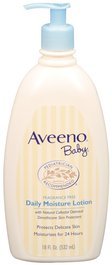 Aveeno Baby Daily Moisture Lotion contains natural colloidal oatmeal blended with rich emollients that soothe and help protect your baby's delicate skin in a gentle way. The naturally nourishing, non-greasy formula absorbs quickly and provides lasting moisture protection with no drying alcohol. It’s hypoallergenic, fragrance-free and won’t clog pores, and best of all it’s formulated to be mild and gentle for daily use on baby’s sensitive skin.