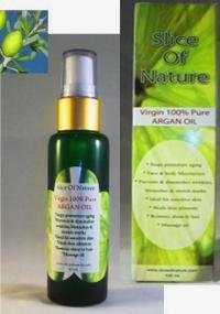 - Slice Of Nature Argan oil is virgin and raw wild crafted from the Argan tree nuts that grows wildly in Morocco. 100% pure, cold pressed first milling only, no deodorization, toasting, alteration or additives. Packaged in an attractive green glass with a gold atomizer. The green glass bottle also protects against degradation. The bottle also comes with an outer box and instruction insert. Exp. Jan 2014